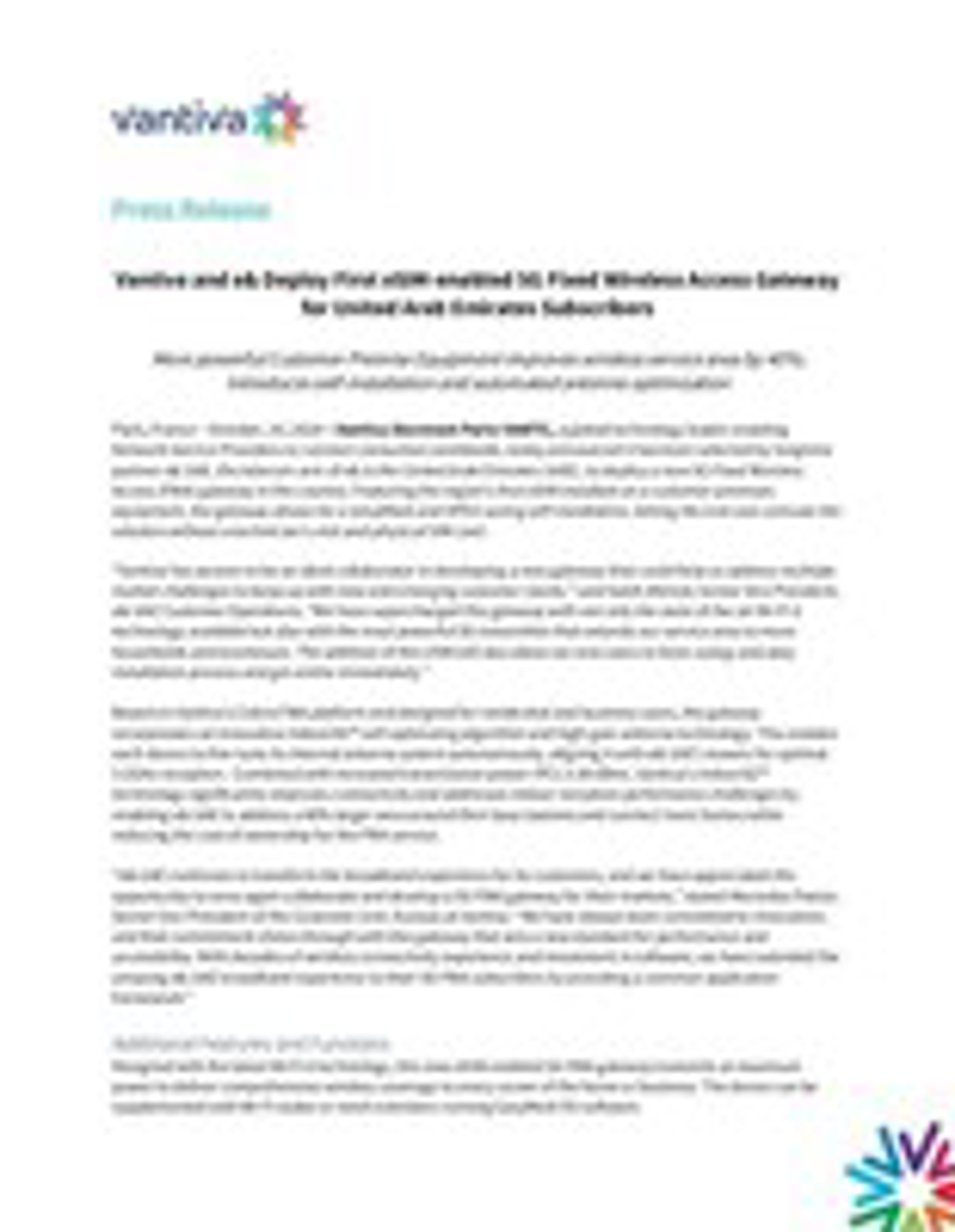 PARÍS, 23 de octubre de 2024 /PRNewswire/ -- Vantiva (Euronext Paris: VANTI), líder mundial en tecnología que permite a los proveedores de servicios de red conectar a los consumidores de todo el mundo, anunció hoy que ha sido seleccionado por su socio e& UAE, la división de telecomunicaciones de e& en los Emiratos Árabes Unidos (EAU), para implementar una nueva puerta de enlace de acceso inalámbrico fijo (FWA) 5G en el país. Con la primera eSIM de la región instalada en un equipo de las instalaciones de un cliente, la puerta de enlace permite una autoinstalación simplificada y que ahorra gastos operativos, lo que permite al usuario final activar la solución sin la visita de un técnico ni una tarjeta SIM física.
