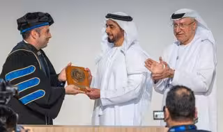 La ceremonia estuvo presidida por Su Alteza Real Saif bin Zayed Al Nahyan, viceprimer ministro y ministro del Interior de los Emiratos Árabes Unidos; Abdulsalam AlMadani, presidente de INDEX Holding y de la Fundación DIHAD, y José Luis Mendoza García, director general de Relaciones Institucionales de la UCAM, a quien acompañó Gonzalo Wandosell, decano de la Facultad de Ciencias Económicas y Empresariales de la UCAM y del DIHAD Humanitarian College.