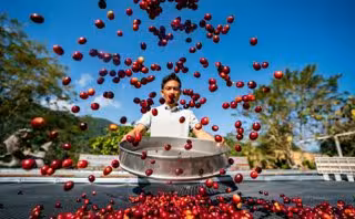 Photo shows a coffer grower dries coffee fruits in Pu'er City, southwest China's Yunnan Province. - XINHUA SILK ROAD/PR NEWSWIRE