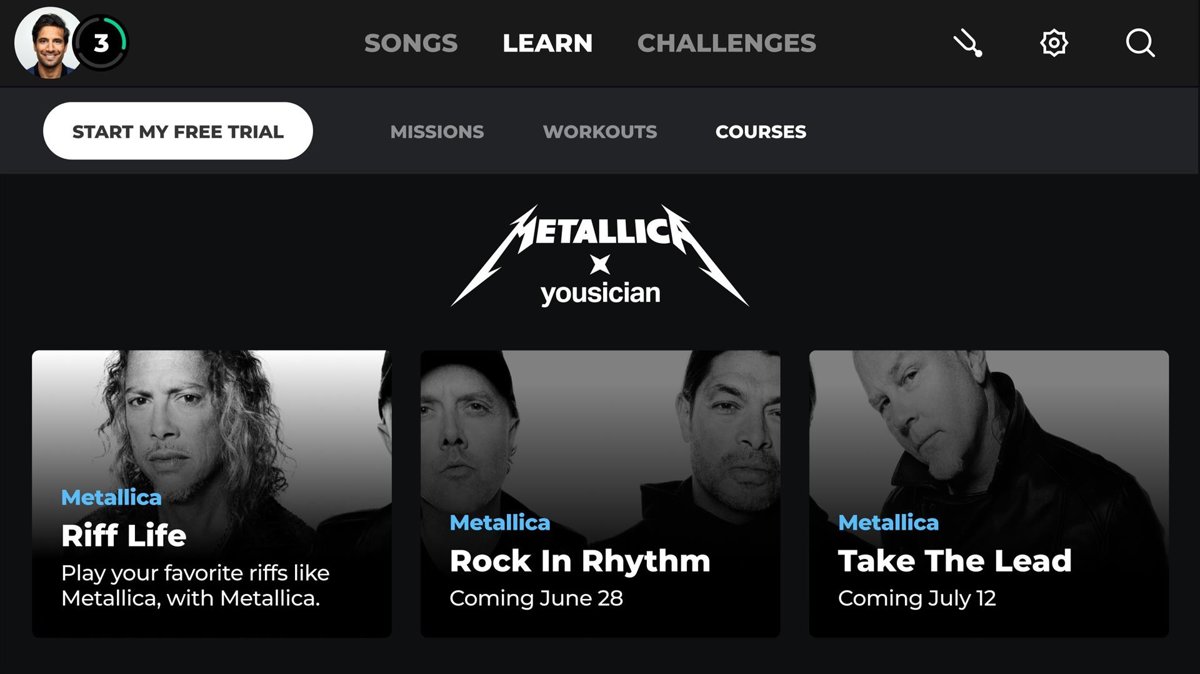 Metallica x Yousician es el último curso de Yousician creado en colaboración con músicos famosos. Los cursos anteriores han sido presentados por los artistas de renombre mundial Jason Mraz y Juanes en asociación con Duolingo.