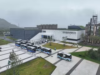 Imagen: La flota de autobuses autónomos conduciendo en el parque de montaña en la Zona Nacional de Desarrollo Industrial Nueva y de Alta Tecnología de Zibo