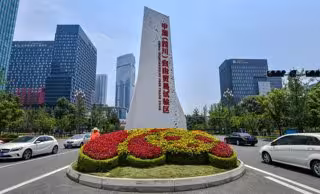A landmark of the China (Sichuan) Pilot Free Trade Zone stands among traffic in Chengdu - CHENGDU COMMERCE BUREAU/PR NEWSWIRE