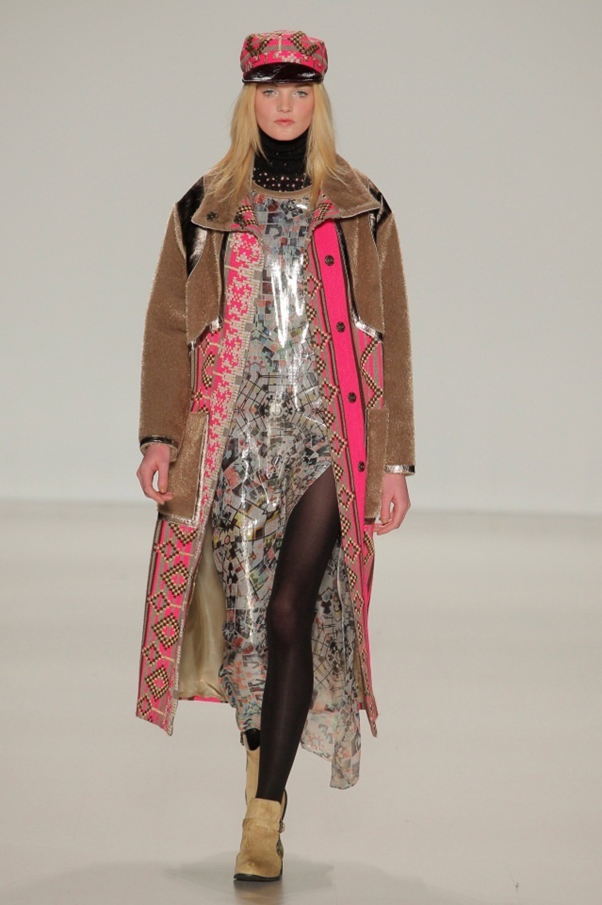 Los típicos colores invernales (negro, gris y camel) funcionan como base sobre la que aplicar colores vivos como el fucsia, el morado o incluso colores neón. También los grafismos plasmados sobre base de chiffón de lamé de seda con brillos metálicos iluminan una parte importante de las piezas.