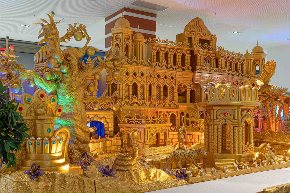 - El elemento central de la exposición será un majestuoso Palacio de Oro de cuatro metros de altura, acompañado del icónico Árbol Mágico de las manzanas doradas
