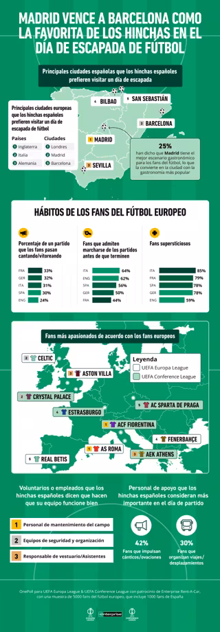 Londres, 20 de febrero de 2026.- La capital española ha resultado ganadora en una votación realizada entre los aficionados para clasificar las mejores ciudades del país para visitar y ver fútbol. Según un nuevo estudio sobre cultura de los seguidores en todo el continente, encargado por la UEFA Europa League y la UEFA Conference League, patrocinado por Enterprise Rent-A-Car y realizado por los expertos en investigación de mercado OnePoll, Madrid ha recibido un firme apoyo del 35 % de los 1000 votantes de España, superando a Barcelona (22 %), Sevilla (12 %) y Bilbao (11 %). El estudio también reveló: