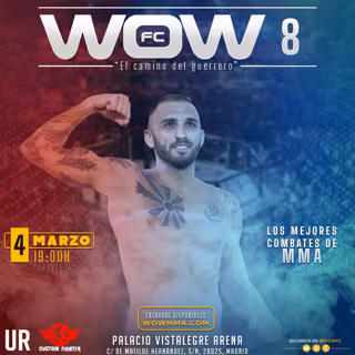 WOW 8, la octava edición de las veladas profesionales de artes marciales mixtas (MMA) organizada por la promotora nacional Way Of Warrior (WOW), llega al Palacio de Vistalegre de Madrid.