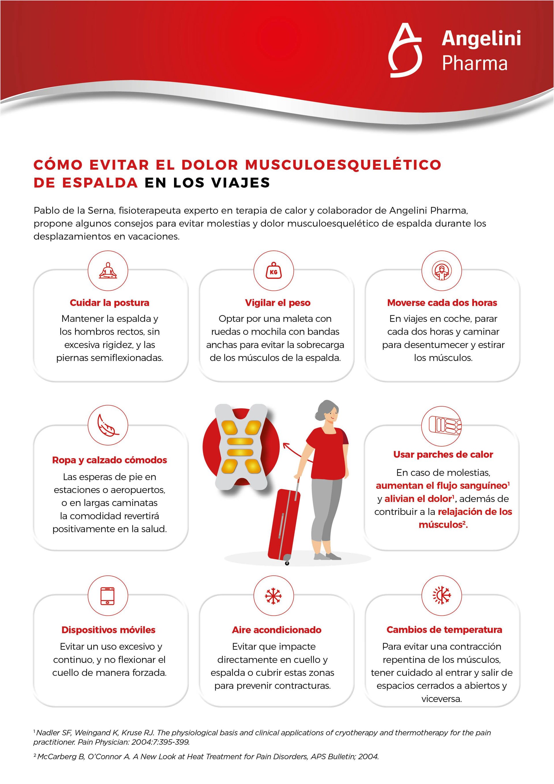 Si a pesar de tomar todas estas precauciones, aparecen molestias de espalda, los parches de calor son muy útiles durante los viajes ya que "son fáciles de colocar, muy efectivos y la mejoría se nota en poco tiempo, de manera que podremos continuar con las actividades vacacionales". De la Serna recuerda que "los parches térmicos terapéuticos aumentan el flujo sanguíneo y alivian el dolor[1], a la vez que ayudan a la relajación de los músculos[2]".