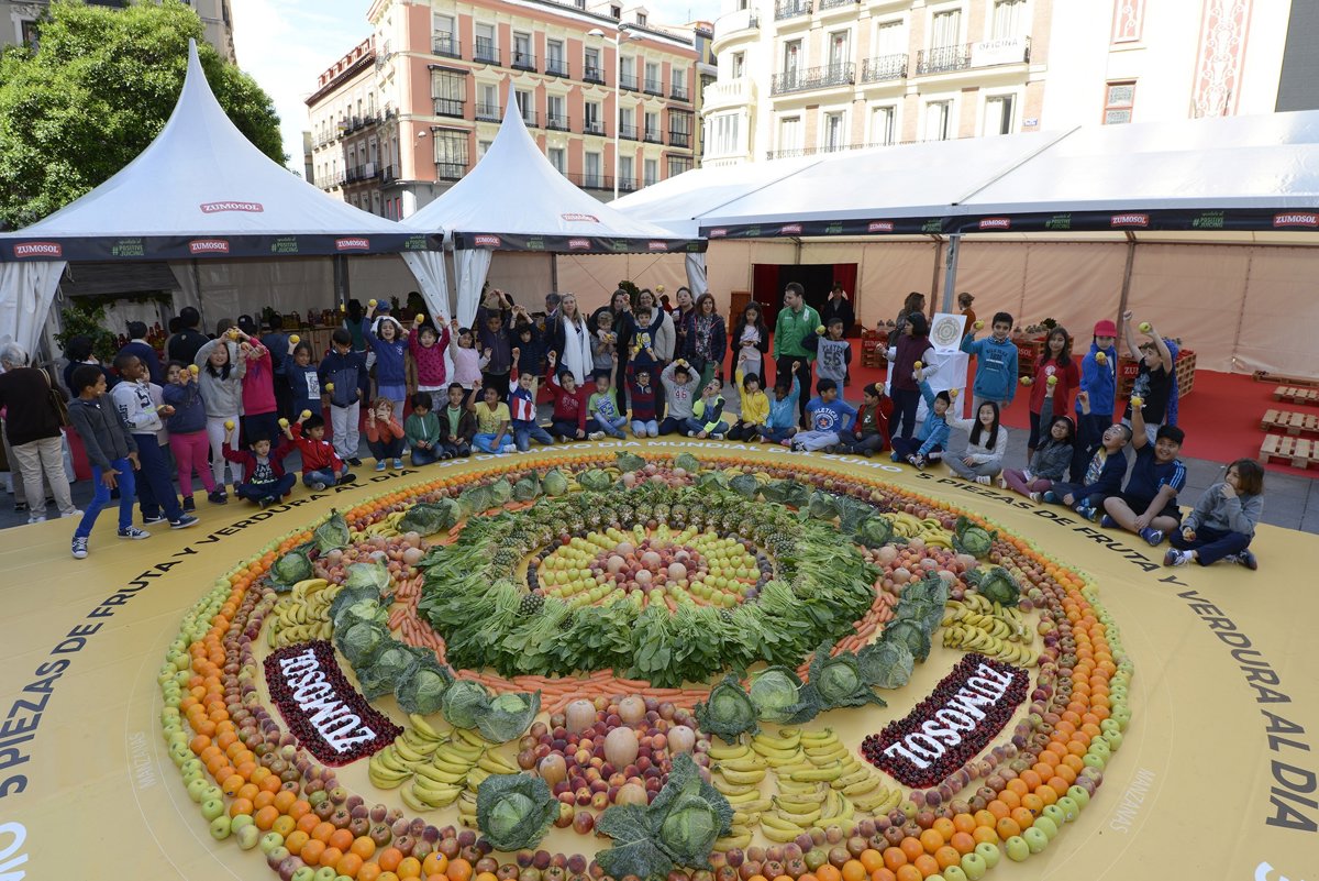Madrid, 30 de mayo de 2016 - Zumosol ha celebrado esta mañana el día internacional del zumo con una acción muy especial en la céntrica plaza de Callao de Madrid. Con el objetivo de concienciar de la importancia de adquirir hábitos de vida saludables desde pequeños, más de 60 niños de Madrid han creado un mandala gigante formado por 1825 frutas y verduras, cantidad que, según la premisa de las 5 piezas al día recomendadas por la OMS, debería consumir una persona a lo largo de un año.
