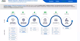 El eje central del proyecto es el Modelo integrado y global de conocimiento en cáncer, una herramienta que permite comparar el estado de distintos aspectos del cáncer a lo largo del tiempo y entre las diferentes comunidades autónomas. El modelo analiza indicadores relacionados con la prevención, la actividad asistencial y los recursos disponibles en el ámbito oncológico, siguiendo el itinerario del paciente desde la prevención y el diagnóstico hasta la atención, el seguimiento y el final de vida. Se trata de un modelo orientado a ofrecer una radiografía estructural del sistema oncológico, no a medir resultados en salud, lo que permite identificar desigualdades territoriales y áreas de mejora.