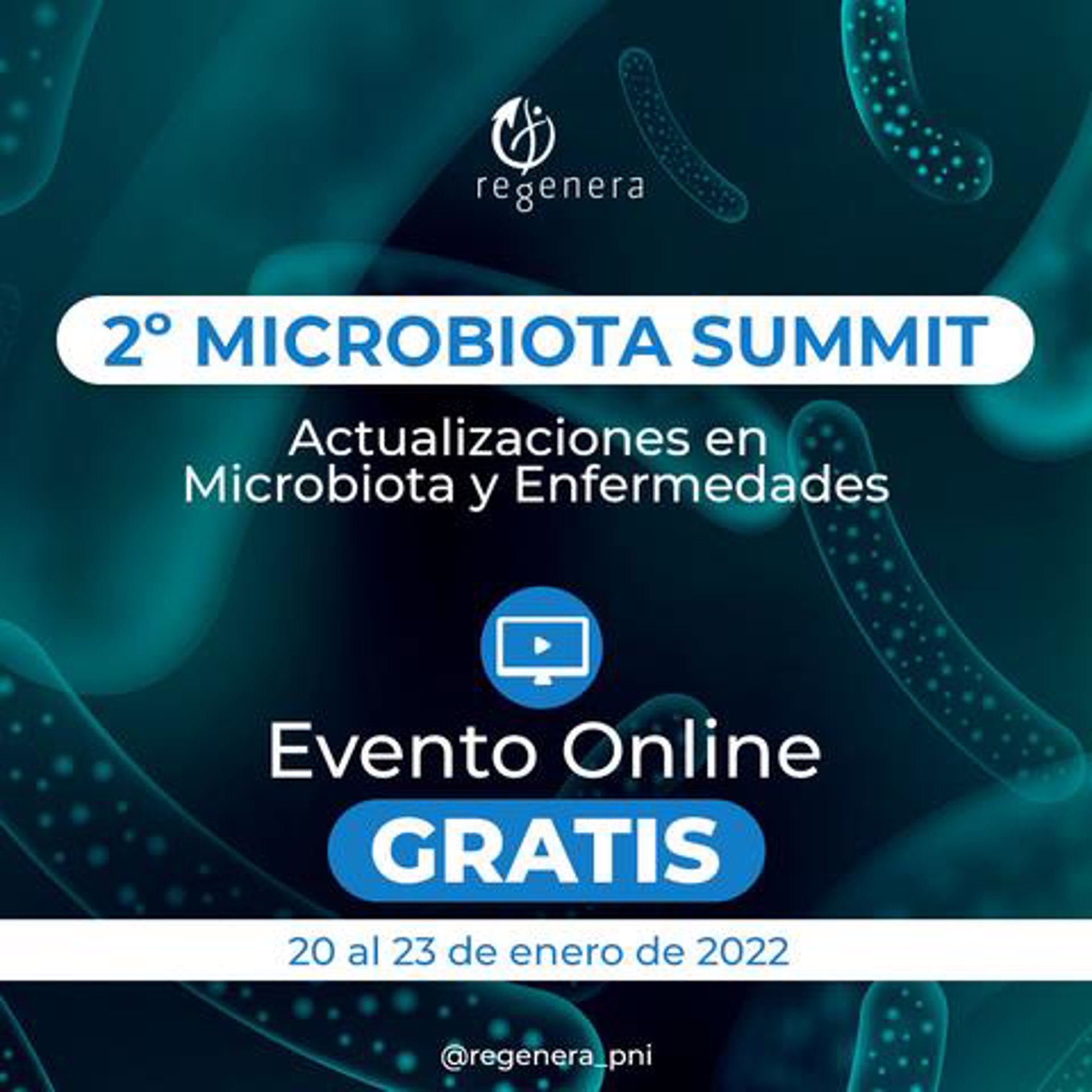 El 2 Microbiota Summit, que hablará sobre actualizaciones en microbiota y enfermedades, se llevará a cabo del 20 al 23 de enero de 2022 de forma online y gratuita. El evento se podrá seguir desde regenerasummit.com, entidad organizadora, y tiene el objetivo de reunir más de 50.000 profesionales de la salud como asistentes