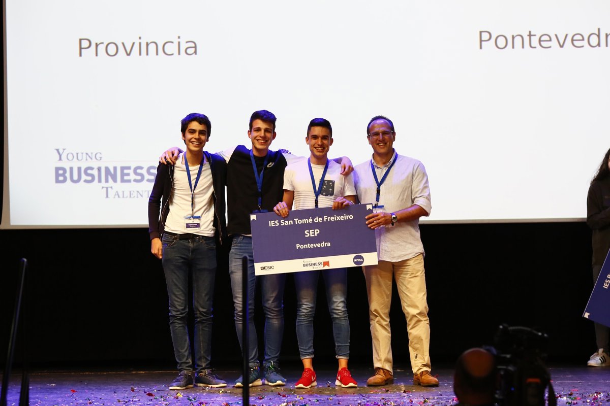 Madrid, 4 de octubre de 2017.- Alumnos del Instituto San Tomé de Freixeiro de Vigo en Pontevedra han resultado ganadores de la final internacional del programa educativo Young Business Talents. Pablo Casas, Sergio Barges y Eloy Núñez han conseguido el título de ‘Mejores empresarios virtuales’ tras competir con los equipos ganadores de los programas Young Business Talents de Grecia, Italia, México y Portugal.