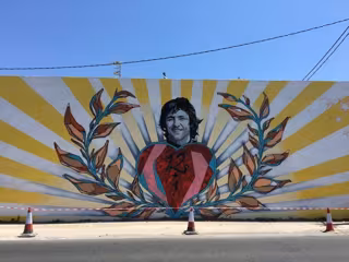Necko detalla que tras el proceso creativo, basado en las numerosas conversaciones con amigos y familia, intenta reflejar la personalidad del deportista: “Me dijeron que era muy abierto, muy de la calle. Quería plasmar eso, pero sin olvidar su gloria deportiva”. Su rostro sonriente sobre un corazón con veladura, que crea un efecto como de un grafiti pintado sobre otros grafitis, forman el centro de la composición que se rodea de los laureles que tantas veces colgaron de su cuello. Para la realización de la obra el artista que ha contado con la colaboración del artista local Tito y el apoyo de Montana Colors.