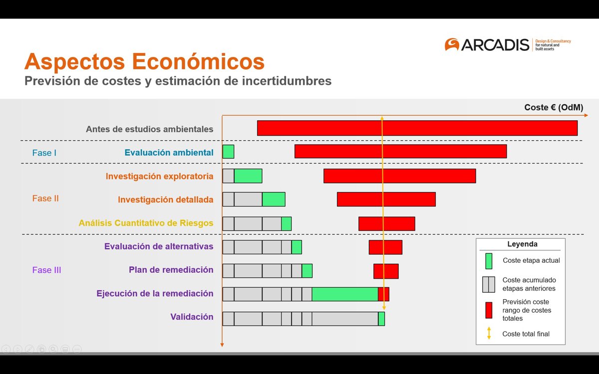 Se discutió también acerca de la Remediación de suelos en emplazamiento potencialmente contaminados, haciendo hincapié en qué los riesgos ambientales, inherentes a este tipo de emplazamientos, son fácilmente gestionables, si se tienen en consideración a tiempo. Asimismo, se discutió cómo es posible reducir las incertidumbres en la valoración de los pasivos, mediante tareas de investigación relativamente poco costosas y de corta duración, minimizando así potenciales sobrecostes a lo largo de la vida del activo. (Gráfico 2)