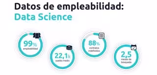 Por otro lado, aquellos que se decantaron por Data Science, tardaron de media 2,5 meses en encontrar empleo, pero su sueldo medio sube ligeramente alcanzando los 22.100€ al año en su primer contrato profesional como juniors.