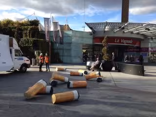 Asimismo, la acción se ha completado con el esparcimiento de una decena de colillas gigantes de goma espuma junto a un camión rotulado con mensajes de la campaña, aparcado en la puerta del centro comercial.