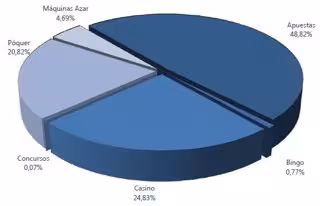 Si nos fijamos en las cantidades jugadas por modalidad, las apuestas se llevan casi la mitad del dinero. Un 48,82% del dinero jugado corresponde a las casas de apuestas, prácticamente el doble del 24,82% que se llevan los juegos de casino. Pese al retroceso de los últimos meses, el póker se mantiene en tercera posición con un 20,82%. A continuación aparecen las máquinas de azar, una de las grandes novedades, que llegan al 4,69%. Las cantidades jugadas en bingo y concursos son casi residuales, por debajo del 1%.