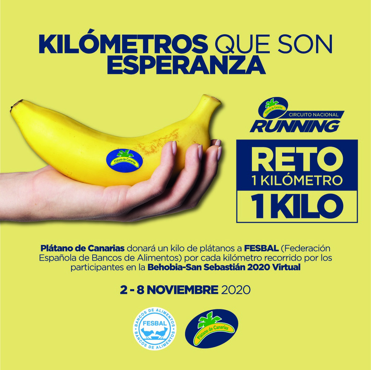 Así, por cada kilómetro que los corredores inscritos recorren durante la celebración de estas tres pruebas virtuales, Plátano de Canarias donará 1 Kilo de plátanos de Canarias a FESBAL (Federación Española de Banco de Alimentos). Es decir, ofrece a todos los aficionados al running una nueva oportunidad para transformar las zancadas en alimento para los que más lo necesitan.