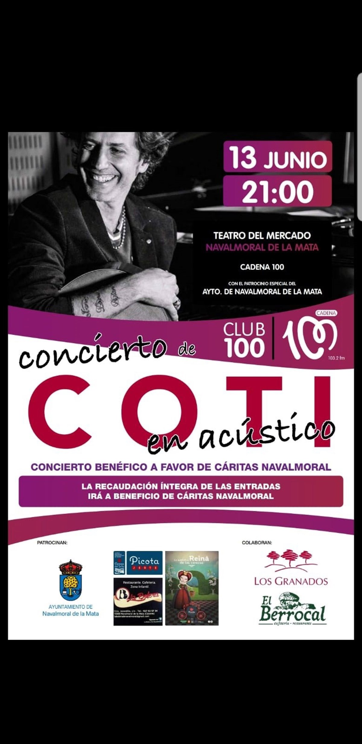 Valle del Jerte, 12 de junio de 2018.- El Consejo Regulador de la Denominación de Origen Protegida Cereza del Jerte patrocina junto al Ayuntamiento de Navalmoral de la Mata, el concierto en acústico que Coti, autor de canciones tan conocidas como ‘Nada fue un error’, ofrecerá mañana miércoles, 13 de junio, a beneficio de Cáritas.