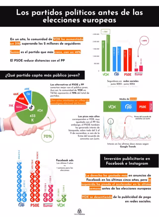 Madrid, 6 de junio de 2024.- Se habla mucho de las encuestas, pero poco de las redes sociales cuando se acerca una jornada electoral. Ninguna es una bola de cristal; sin embargo, métricas como el número de seguidores, poder de penetración en una app o inversión en campañas online ayudan a trazar un escenario a largo plazo.