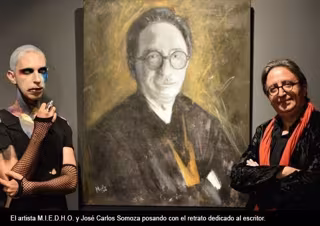 La Sala Espacio Prado del Ateneo de Madrid colgaba el sábado el cartel de aforo completo. No cabía un alfiler. Se celebraba la inauguración de la exposición Art Of Somoza y era complicado moverse entre el tumulto y los corrillos de artistas, modelos, escritores y amantes del arte. Pero entre la muchedumbre destacaban la mirada inteligente de José Carlos Somoza detrás de sus gafas redondas, y el peculiarmente caracterizado como personaje de su propia obra, diríase surgido de los cuadros mismos, Iván MIEDHO, ambos muy solicitados por la concurrencia.