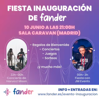 A través de este evento musical que tendrá lugar el día 10 de junio, Fander presenta su propuesta de la mano de algunos de los músicos de la propia plataforma. El evento estará abierto a amantes de la música que podrán disfrutar de las actuaciones de Havest Moon (dúo de versiones) y JM Events (DJ). Los usuarios de Fander pueden contratar de manera rápida y sencilla a cualquier músico, banda o DJ para cualquier tipo de evento o celebración