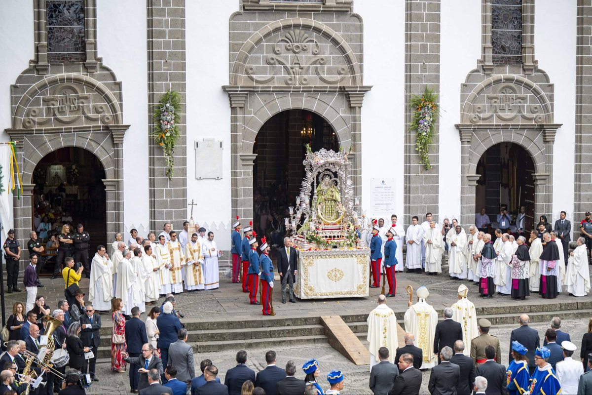 La Romería-Ofrenda a la Virgen del Pino representa uno de los principales rituales de las fiestas. Las ocho islas y los 21 municipios de Gran Canaria convergen en la Plaza de Teror para ofrendar a la Virgen carretas y cestos llenos de productos de la tierra. No se trata solo de una ofrenda religiosa, sino de un acto de generosidad y solidaridad porque toda la recolecta va directamente hacia ONGs y otras entidades de carácter social.