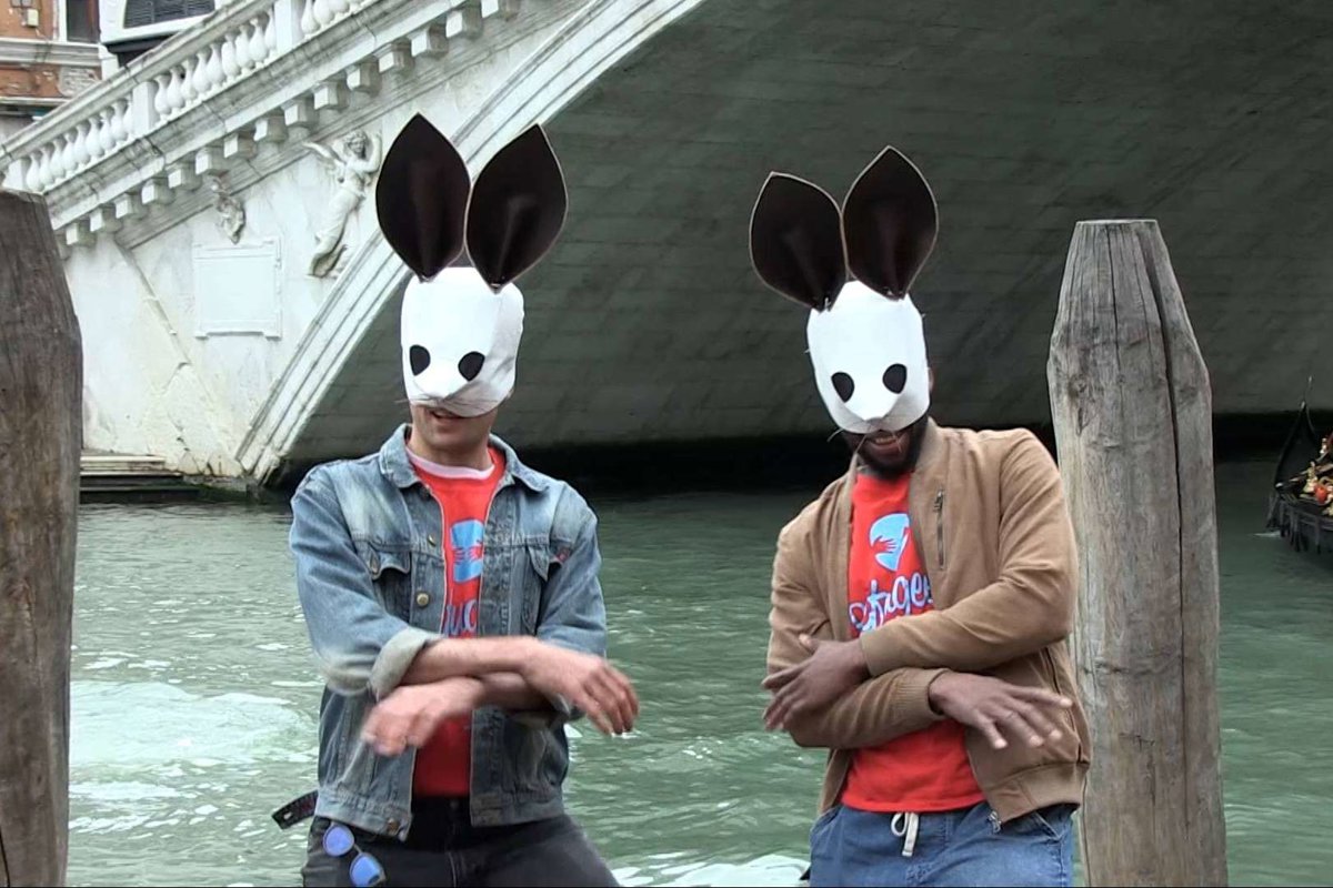 Luego, en horas de la tarde, los visitantes de la zona Giardini fueron testigos de la reinterpretación visionaria del Poema Público sobre Migración de Alain Arias Misson: con la ayuda de jóvenes estudiantes de arte, ataviados con las icónicas máscaras de conejo del colectivo, Food of War deletreó con letras a gran escala las frases I AM MIGRANT y I AM REFUGEE.