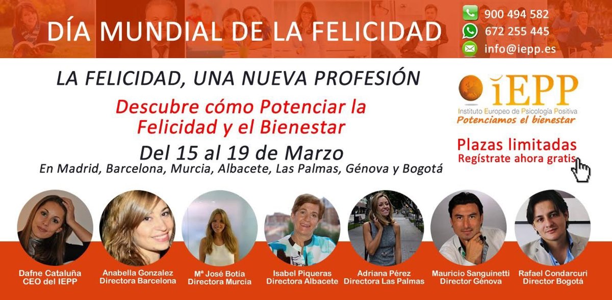 El Instituto Europeo de Psicología Positiva (IEPP) está ultimando los preparativos de los eventos que celebrará en la semana del lunes 14 al domingo 20 de marzo, con motivo del Día Mundial de la Felicidad, decretado por la ONU en 2012 para cada 20 de marzo.