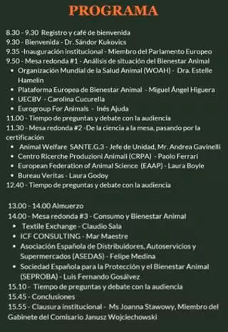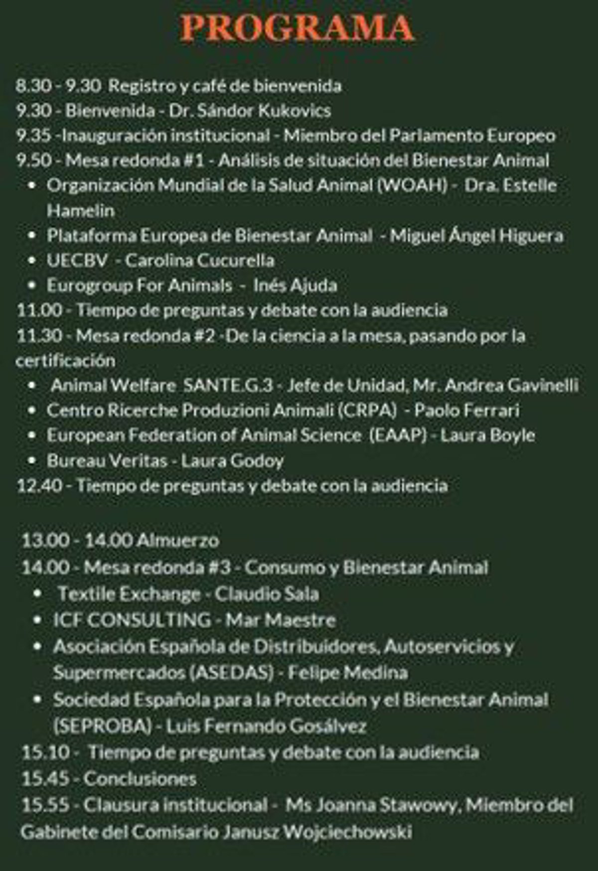 Como punto de partida, la primera mesa redonda con el título "Análisis de la situación del Bienestar Animal" y la participación de la Dra. Estelle Hamelin, de la Organización Mundial de la Salud Animal (WOAH), de Miguel Ángel Higuera, de la Plataforma Europea de Bienestar Animal, Carolina Cucurella, de la UECBV, e Inés Ajuda del Eurogroup For Animals, hará una exposición sobre cuál es la situación actual del bienestar animal a nivel europeo.