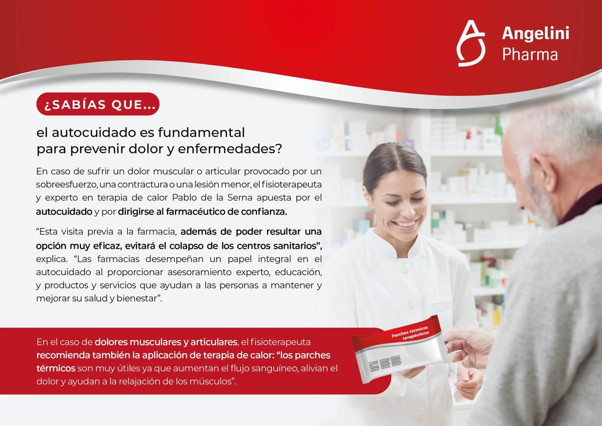 El autocuidado es fundamental para prevenir dolor y enfermedades. El fisioterapeuta y experto en terapia de calor Pablo de la Serna, colaborador de Angelini Pharma España, destaca el papel de la farmacia como punto de asesoramiento y recomendación para tratar síntomas menores y no colapsar los servicios sanitarios, a la vez que ofrece algunos consejos para ayudar a mantener una vida saludable