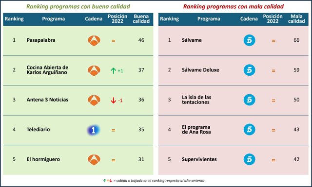Sálvame (66%), Sálvame Deluxe (59%), La Isla de las tentaciones (50%), El programa de Ana Rosa (43%) y Supervivientes (42%) son los programas que componen este TOP 5 de peor calidad, repitiendo posiciones con respecto al 2022.