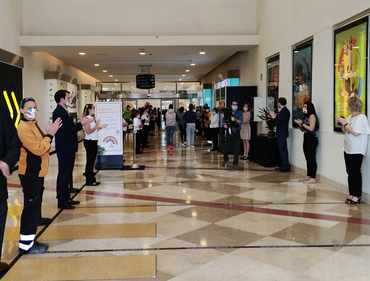Los clientes que se han acercado para realizar sus compras han recibido un Welcome Pack con una mascarilla personalizada tanto para adultos como para niños y un gel hidroalcohólico. El centro ha querido además darles la bienvenida y amenizarles la visita con la actuación de dos bailarinas aladas vestidas con luces led y la música de un saxofonista.