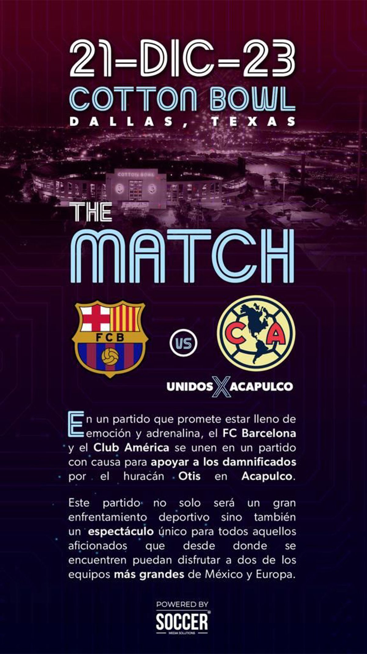 El pasado 17 de noviembre, Soccer Media Solutions anunció el partido The Match FC Barcelona vs Club América Unidos x Acapulco, un evento benéfico que se llevará a cabo el próximo 21 de diciembre en el estadio Cotton Bowl de Dallas, Texas.
