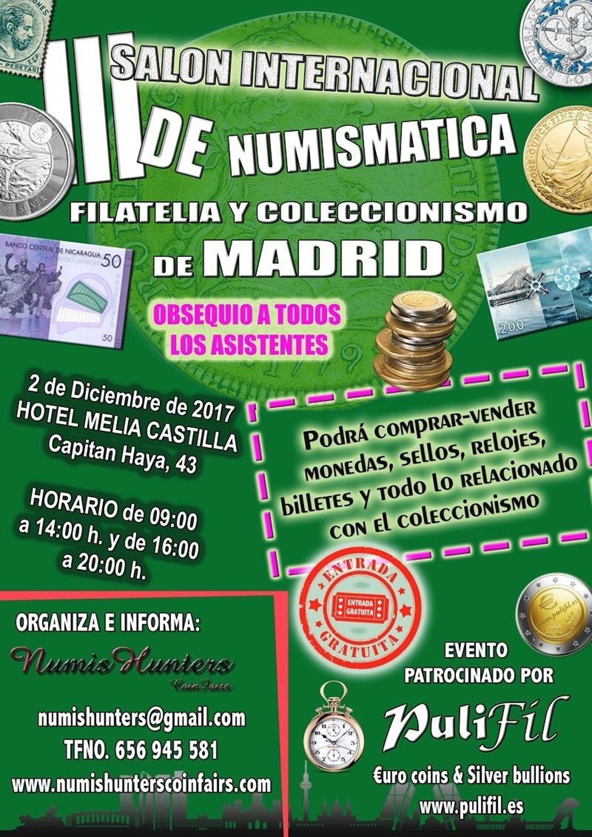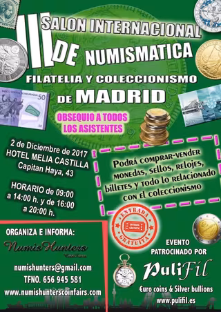 De nuevo, la empresa líder en organización de eventos numismáticos NumisHunters SL apuesta por Madrid como uno de los centros nacionales de la numismática, la filatelia y todo aquello relacionado con el coleccionismo. La ciudad acogerá un evento único en el que profesionales venidos de toda España se congregaran el próximo sábado 2 de diciembre en el Hotel Meliá Castilla