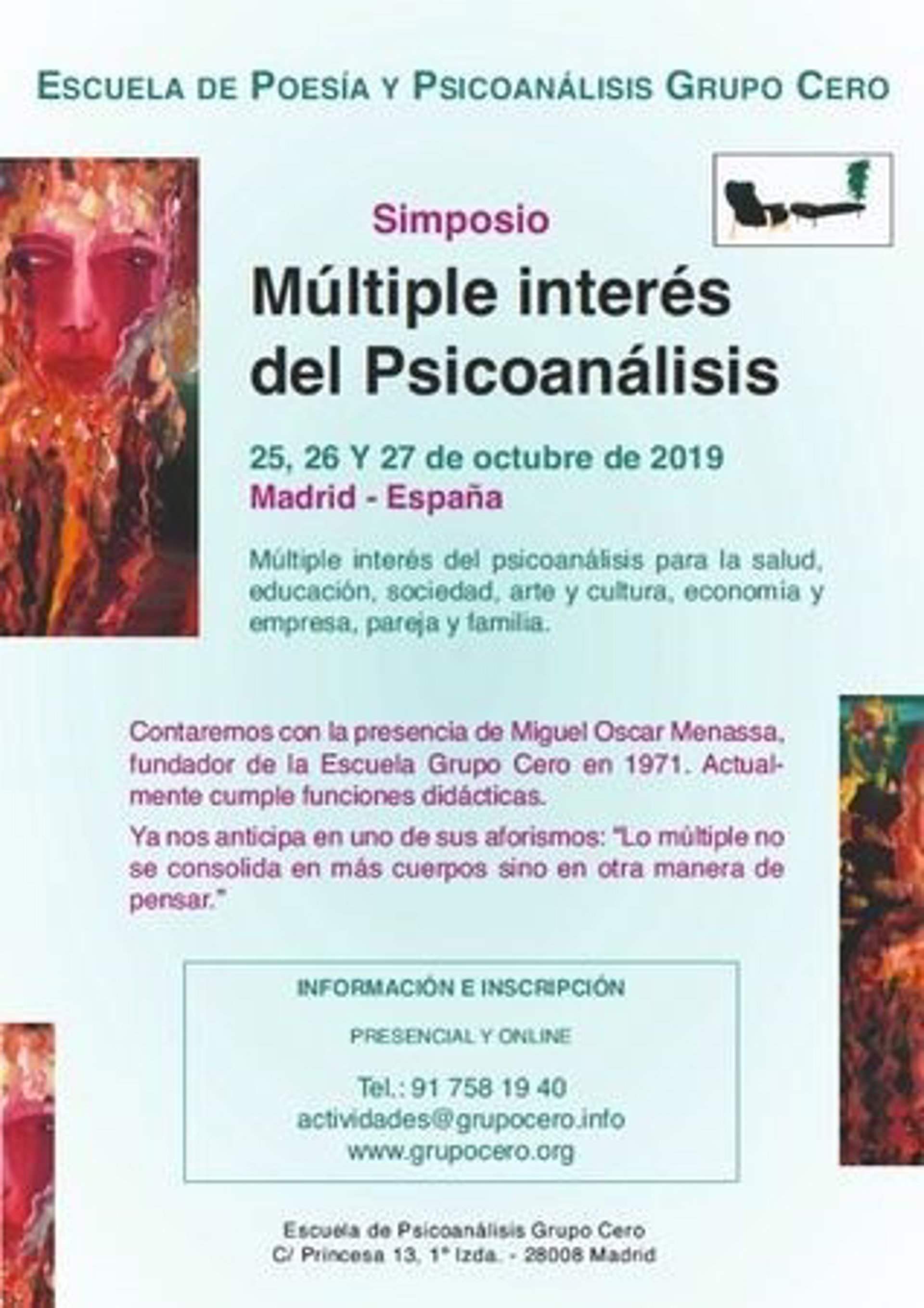 La Escuela de Psicoanálisis y Poesía Grupo Cero organiza el simposium Múltiple interés del Psicoanálisis en Madrid los días 25, 26 y 27 de octubre de 2019, en la sede de la Escuela de Psicoanálisis y Poesía Grupo Cero situada en C/ Princesa n 13, 28008 y tiene como objetivo crear un punto de encuentro y un foro de intercambio de conocimientos y experiencias de la praxis psicoanalítica en relación con el múltiple interés del psicoanálisis en la actualidad en diferentes áreas de inscripción social como son salud, educación, sociedad, arte y cultura, economía, pareja y familia.