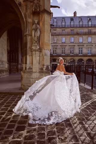 Tejidos escogidos de alta calidad como el encaje y aplicaciones exclusivos como cristales o las perlas son elementos que, con su singularidad, subrayan el toque exclusivo de su Alta Costura como elemento diferenciador de esta casa italiana. Es un homenaje a la Haute Couture como una obra de arte, para dar forma y vestir a la mujer en el día más importante de su vida.