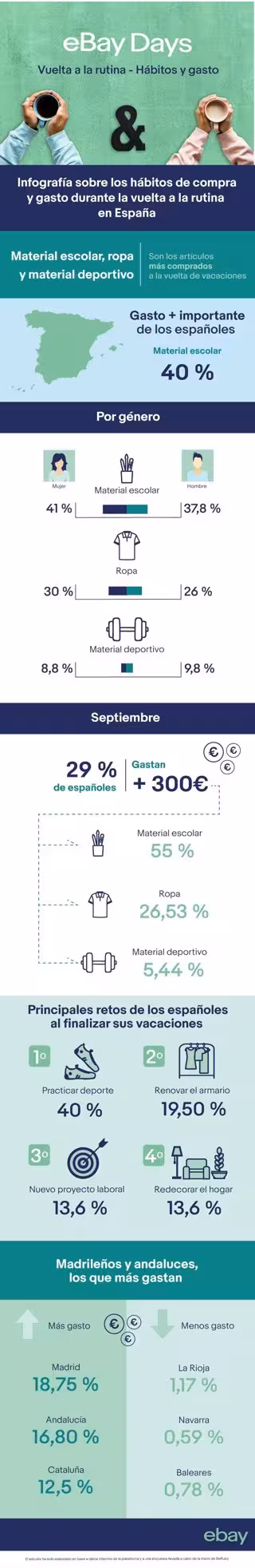 Material escolar, renovación de vestuario, equipamiento deportivo Volver a la rutina no consiste solo en despedirse de las vacaciones de verano, sino también en gastar dinero. Tanto es así que, con motivo de la celebración de sus eBay Days, eBay, la compañía líder en el comercio global, ha elaborado un completo estudio sobre hábitos y tendencias de consumo durante la vuelta a la rutina. Según el estudio, el 28,9% los españoles gasta más de 300 euros durante el mes de septiembre, siendo el material escolar, la ropa y el equipamiento deportivo los mayores desembolsos.