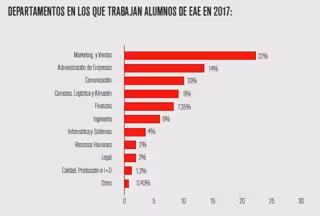 Los principales sectores en los que trabajan los alumnos son la consultoría, asesoría y auditoría (16,1 %), en informática y tecnología (13%), en banca y seguros (10,3%), en gran consumo (9,7%), en el sector industrial (6%), construcción en inmobiliaria (5,90%), ventas y marketing (5,50%) y medios de comunicación (5,10%), entre otros. Por departamentos, la clasificación está liderada por Marketing y Ventas (22%), Administración de Empresas (14%), Comunicación (10%), Compras, Logística y Almacén (9%), Finanzas (7,35%), Ingeniería (6 %), Informática y sistemas (4%), Recursos Humanos (2%), Legal (2%), entre otros.