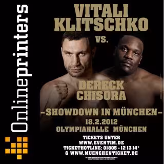 diedruckerei.de y Onlineprinters, el combate de boxeo por el  titulo de los pesos pesados entre el campeón del mundo, según el CMB, Vitali Klitschko y el aspirante británico Dereck Chisora el 18 de Febrero de 2012 en el Olympiahalle de Munich.