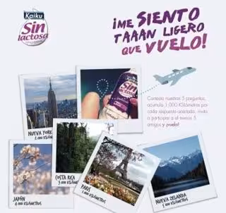 Bajo el eslogan, "Me siento tan ligero que vuelo" la marca Kaiku Sin Lactosa ha lanzado su última campaña de marketing en internet: una aplicación de Facebook con un cuestionario sobre destinos turísticos. Los seguidores de la marca en esta red social pueden ganar, sólo por responder a las preguntas y compartirlo con sus amigos, un viaje a París, Nueva York, Costa Rica, Japón o Nueva Zelanda para dos personas. El plazo para participar termina el próximo 18 de noviembre. A partir de entonces se realizará el sorteo para elegir al afortunado ganador.