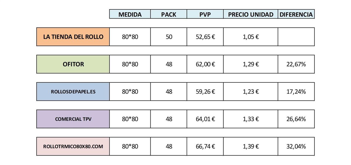 Comparativa con los packs de 48 rollos térmicos de 80x80 (los más vendidos en internet).