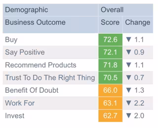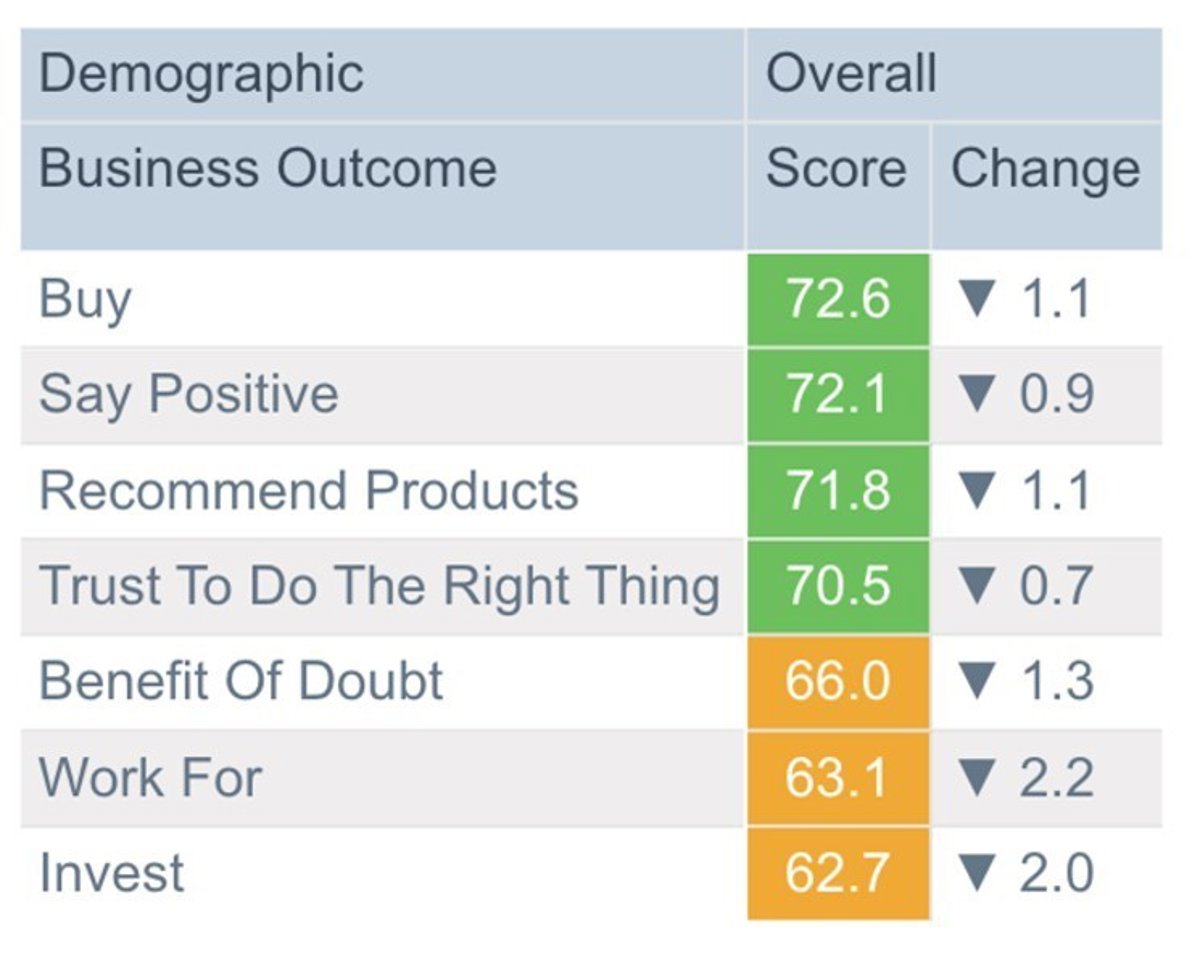 En 2022, el RepTrak Reputation Score global bajó por primera vez desde 2018. En 2023, esta disminución continuó a escala global, con las Puntuaciones de Reputación globales estableciéndose en un promedio de 73,2, por debajo del 74,2 de 2022.