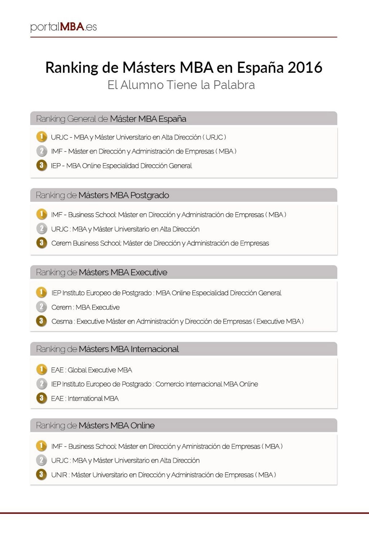 En el Ranking General aparecen aquellos Máster que de entre todos los programas de PortalMBA.es suman más interés según las mencionadas variables. En el Ranking de Programas de Postgrado encontramos los Máster más demandados orientados a los recién licenciados. En el Ranking de Máster MBA Executive tenemos los Máster en Dirección de Empresas orientados a Ejecutivos con experiencia previa. También mostramos el ranking con los Máster MBA con orientación Internacional. Y finalmente, el Ranking de MBA Online nos presenta aquellos programas que suman un mayor interés en modalidad a distancia u online. Así, si un máster MBA es por ejemplo un MBA executive online, se mostrará en las categorías de Executive y de Online y competirá en ambos ranking.