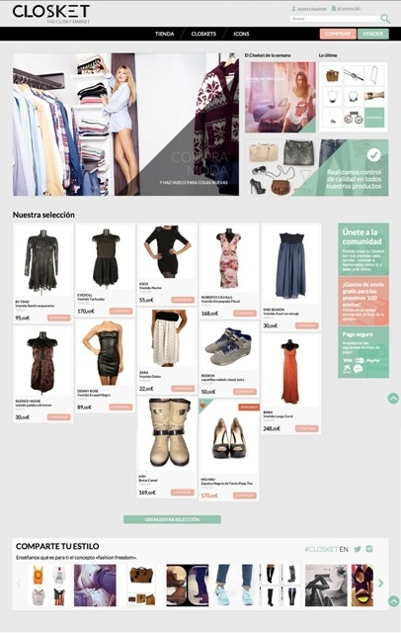 ¿Te gusta la ropa de calidad a un precio inmejorable? Entonces Closket es tu sitio. Su funcionamiento es muy sencillo: elige la sección que te interesa (mujer, hombre e infantil), encuentra ropa de primeras marcas a mitad de precio o más, ¡y renueva tu fondo de armario!