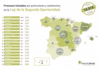 En la Comunidad de Castilla y León son más de 325 las personas en situación de sobre endeudamiento que se han solicitado acogerse a la Ley de la Segunda Oportunidad, lo que representa el 3,09 % del total en España. De todos los casos tramitados en dicha comunidad, el 85 % los ha llevado a cabo Repara tu Deuda, despacho de abogados que inició su actividad el mismo año que entró en vigor la ley en 2015. Este balance sitúa a la Comunidad Castilla y León en el septimo puesto del ranking nacional, por detrás de Cataluña (3954), Madrid (1674), Valencia (984), Andalucía (805) y Aragón (589) y Baleares (348)