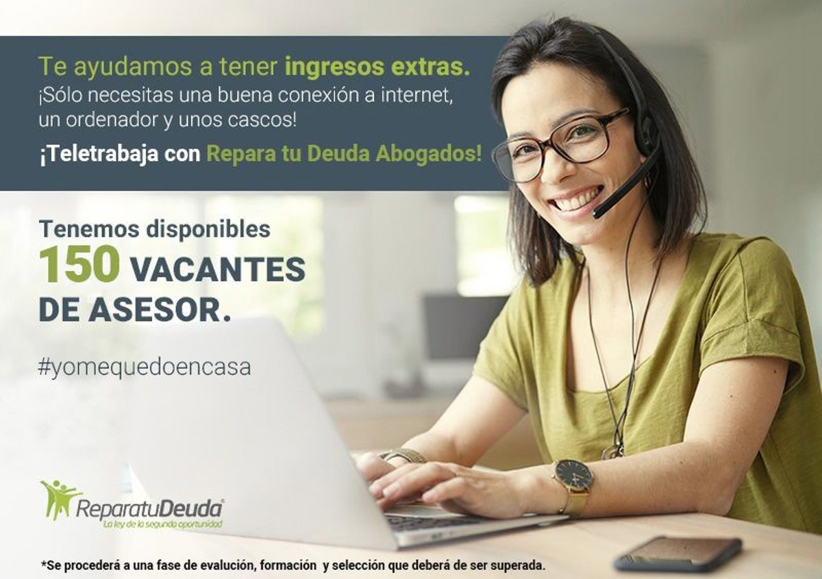 Hemos visto una oportunidad en este incremento de las contrataciones -explican los responsables de la compañía- también en el sentido de poder ayudar a nuestros clientes facilitándoles que tengan unos ingresos extra; para ello ofertamos 150 puestos de teletrabajo como asesor, para los que solamente se requiere un ordenador con conexión a internet y unos casc y por supuesto pasar un periodo de formación y evaluación por parte del despacho de abogados. El despacho de abogados considera que las personas que han decidido tomar la iniciativa de solucionar sus problemas de deudas y han reconocido su mala situación son las mejores personas para empatizar con el resto de población que aun no se han convencido o han tenido el valor para afrontar su problema.