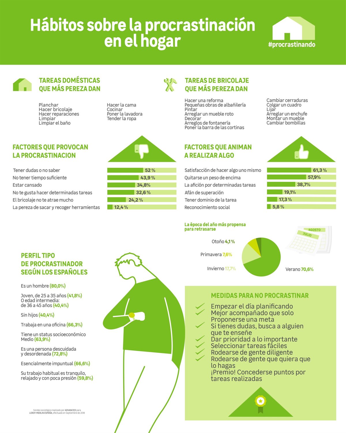 Pero como casi todo en la vida tiene solución, las tres medidas que los españoles consideran más eficaces para reducir la procrastinación son: empezar el día planificando lo que se va a hacer, compartir la tarea y ponerse metas. A ellas se añaden otras como pedir a alguien que enseñe las tareas que no se saben hacer, priorizar lo importante y seleccionar tareas fáciles. Leroy Merlin te puede ayudar a decir adiós a la procrastinación. ¿Empezamos en la Gran Fiesta de la Casa?