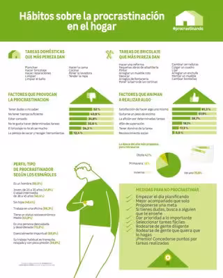 Una reforma integral de la casa, pequeñas obras de albañilería, pintar y lijar son las tareas de bricolaje que más pereza nos dan a los españoles. En cambio, apenas procrastinamos cambiando bombillas, montando un mueble y arreglando algún enchufe o interruptor, según un informe de la firma de estudios de mercado Advanced elaborado para Leroy Merlin. · La percepción general acerca de quién procrastina más en España, sitúa en primer lugar a andaluces y canarios. Navarros, aragoneses, cántabros y riojanos ocupan los últimos lugares. Quienes menos se retrasan en tareas de bricolaje son los vascos, muy por encima de catalanes, asturianos y madrileños.