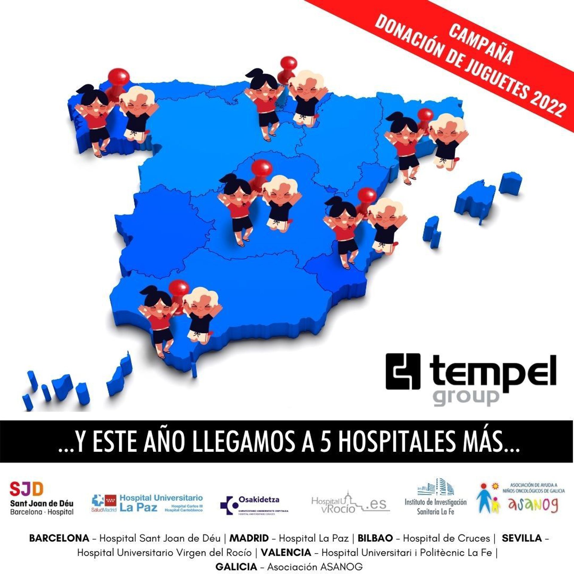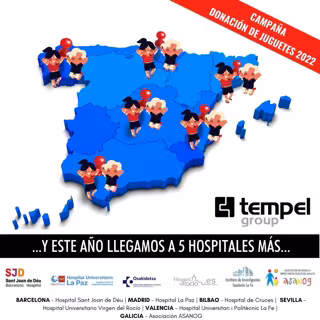 Tempel Group, empresa especializada en el campo de la energía, donará juguetes nuevos a niñas y niños de entre 0 y 16 años hospitalizados en hospitales repartidos por todo el territorio español. Entre los hospitales que recibirán las donaciones de juguetes se encuentran el Hospital de Sant Joan de Déu (Barcelona), el Hospital la Paz (Madrid), el Hospital Virgen del Rocío (Sevilla), el Hospital de Cruces (Bilbao), Hospital Universitari i Politcnic La Fe (Valencia) y la Asociación ASANOG (Galicia)
