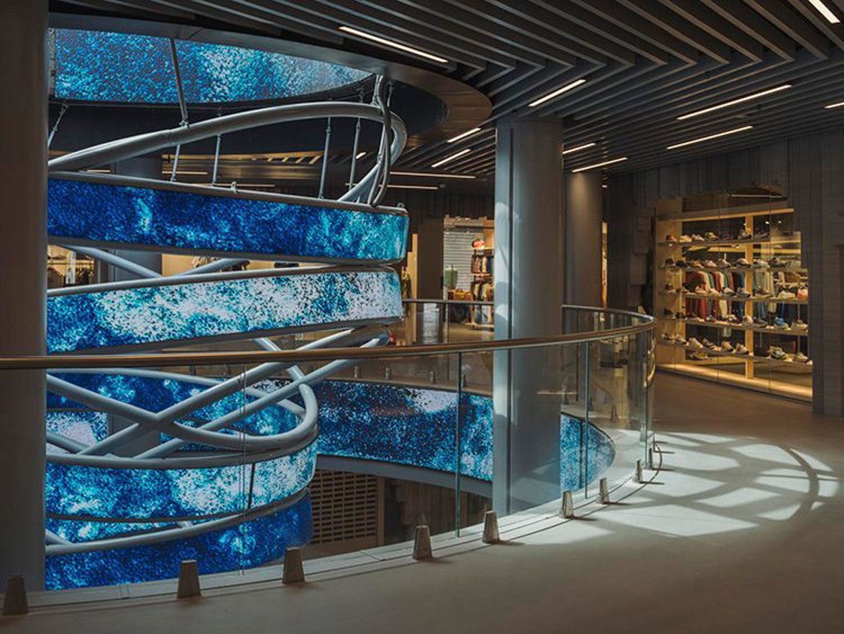 El corazón del espacio lo ocupa una escultura monumental suspendida en el atrio central, que mediante proyecciones digitales envuelve al visitante en una coreografía de luz, color y movimiento evocadora del ecosistema marino. Esta pieza, junto con una estructura cromada que da la bienvenida desde la calle y una línea lumínica en el techo, conforman el sistema de instalaciones digitales que definen el recorrido.